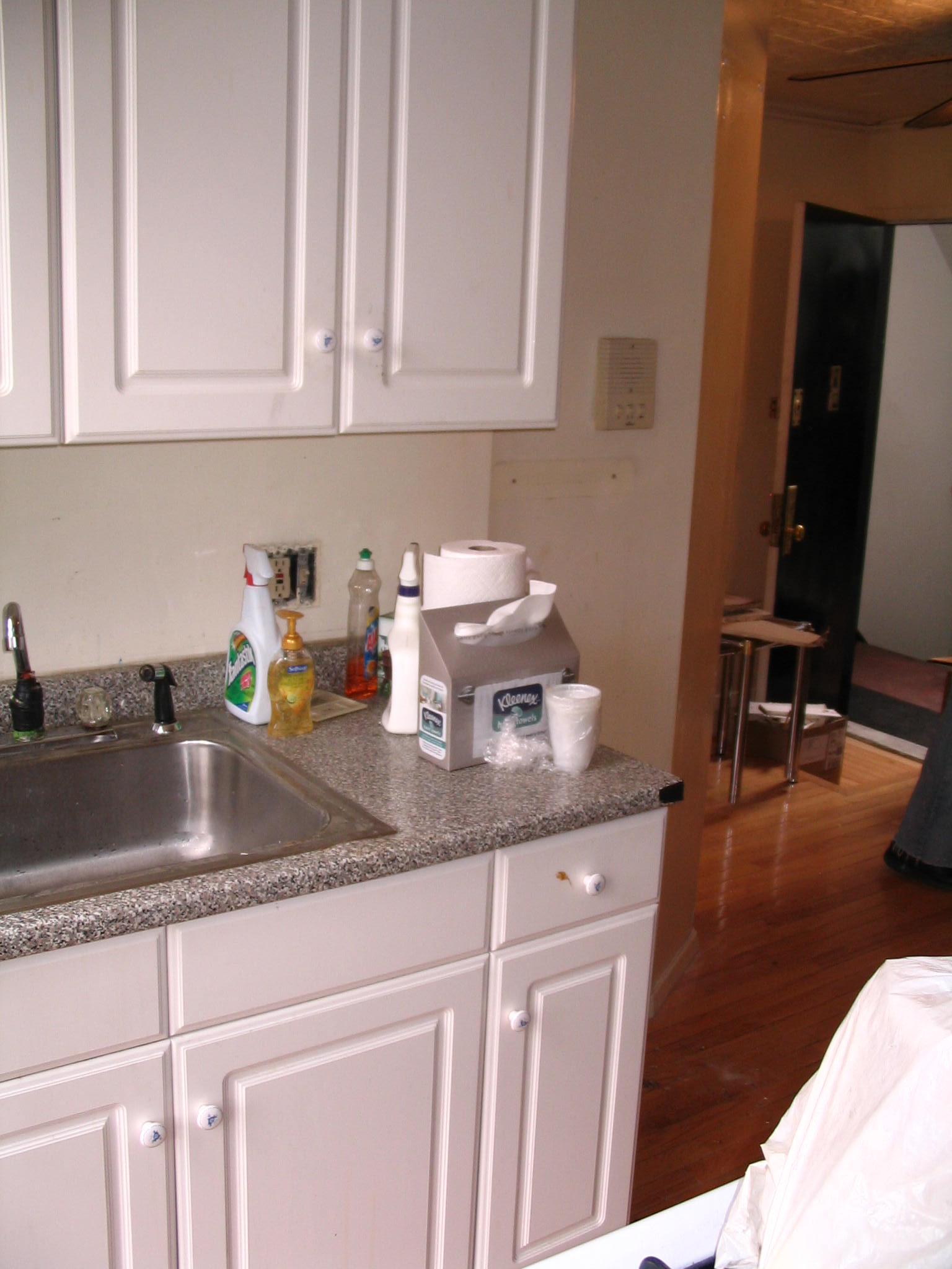 Notice the black tape around the faucet, and the rust around the edge of the sink’s perimeter. We tossed all of it but we should have kept the cabinet’s doorknobs, now that I think of it.