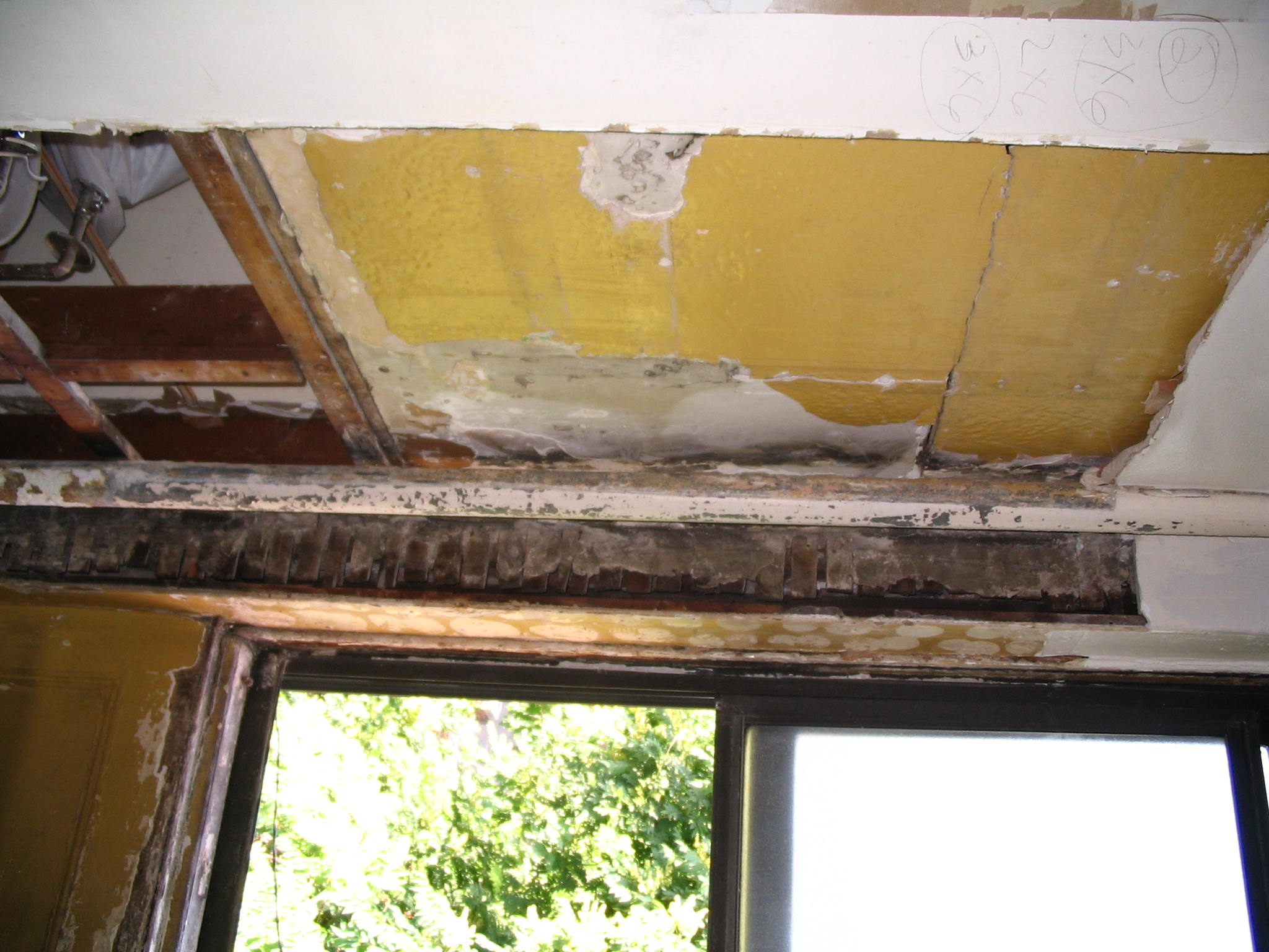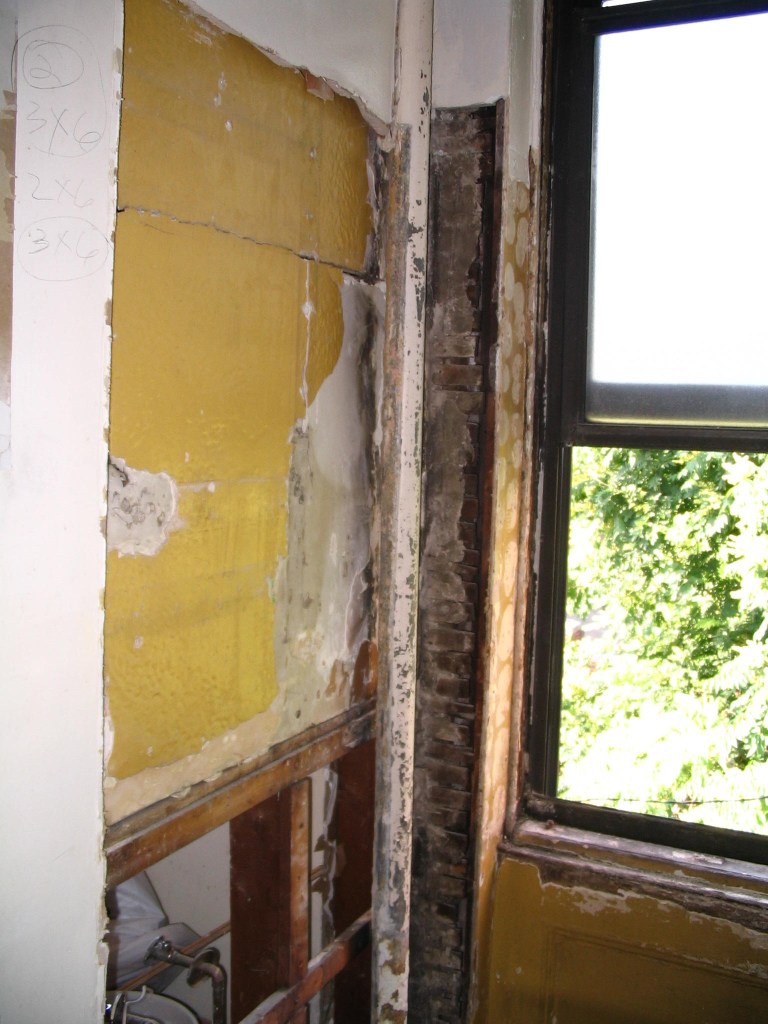 Here, in the bathroom, with the wall cut away for the rough-in, you can see into the kitchen. With the old tub removed, we discovered marble, the original octagonal floor tile, and a wooden-framed window, which we decided we will recreate because we liked the idea so much.