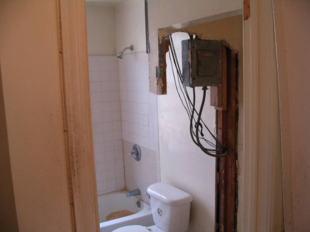 The linen closet in the bathroom was yanked out and that was where the fuse box was contained. Bcause the bathroom had been enlarged to contain a linen closet by a previous tenant, the fuse box had to also be moved. It was amazing to see where it was moved to.