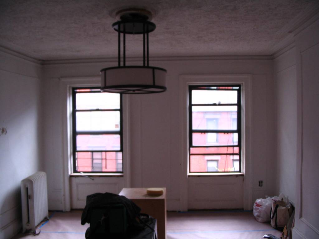 Stucco ceiling, and an ugly ceiling light. Broken windows and an old iron clad radiator. These windows face south. Glorious sun pours in during daytime.