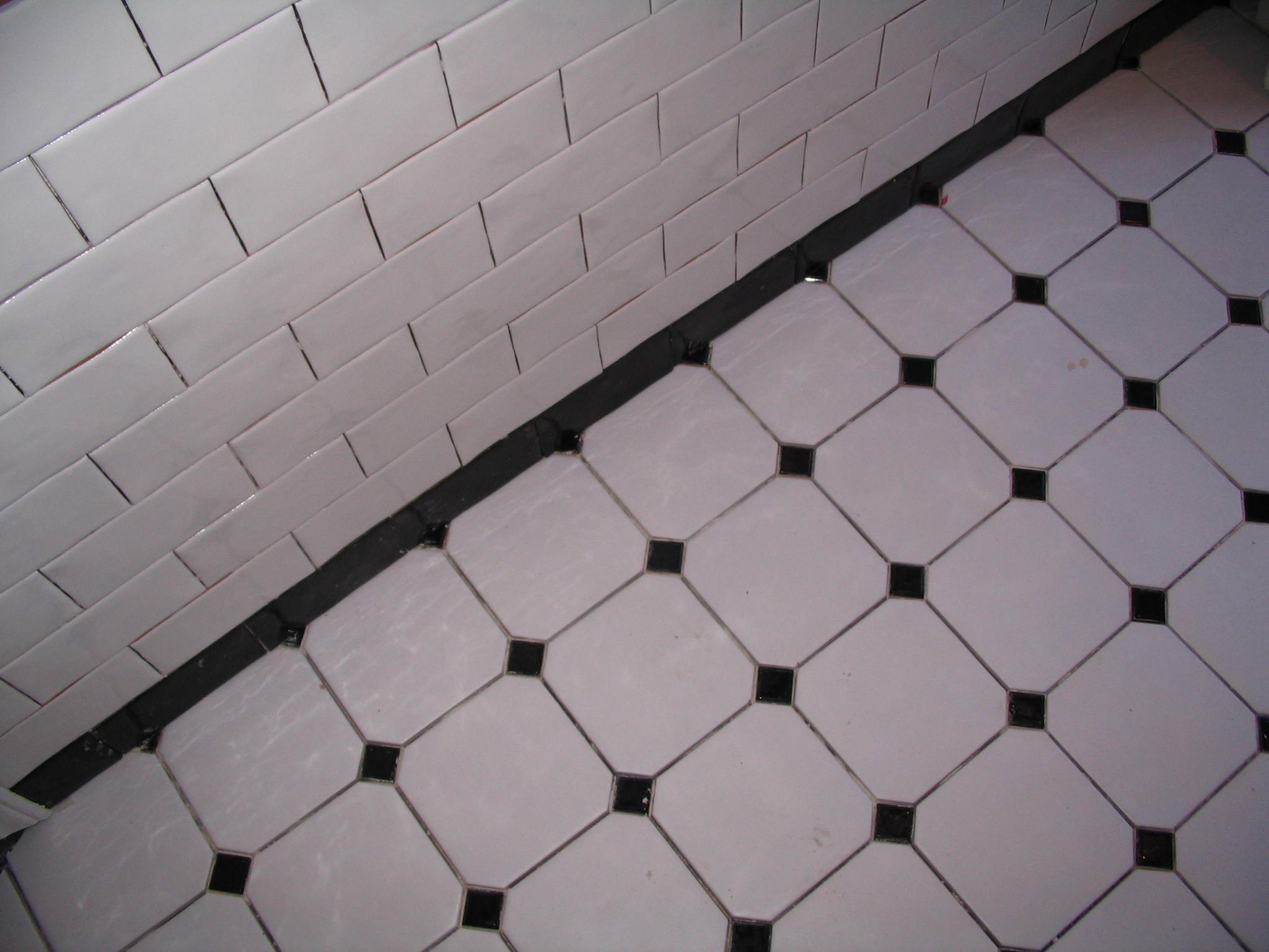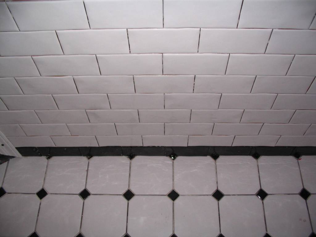 The bathroom is turning into a dream come true. This is an in-progress shot. The floor is done. The subway tile is starting to go up on the walls. The walls will be capped with one row of pencil stripe black tile, one row of white, then a final row of black. After the walls are done, the grouting will begin.