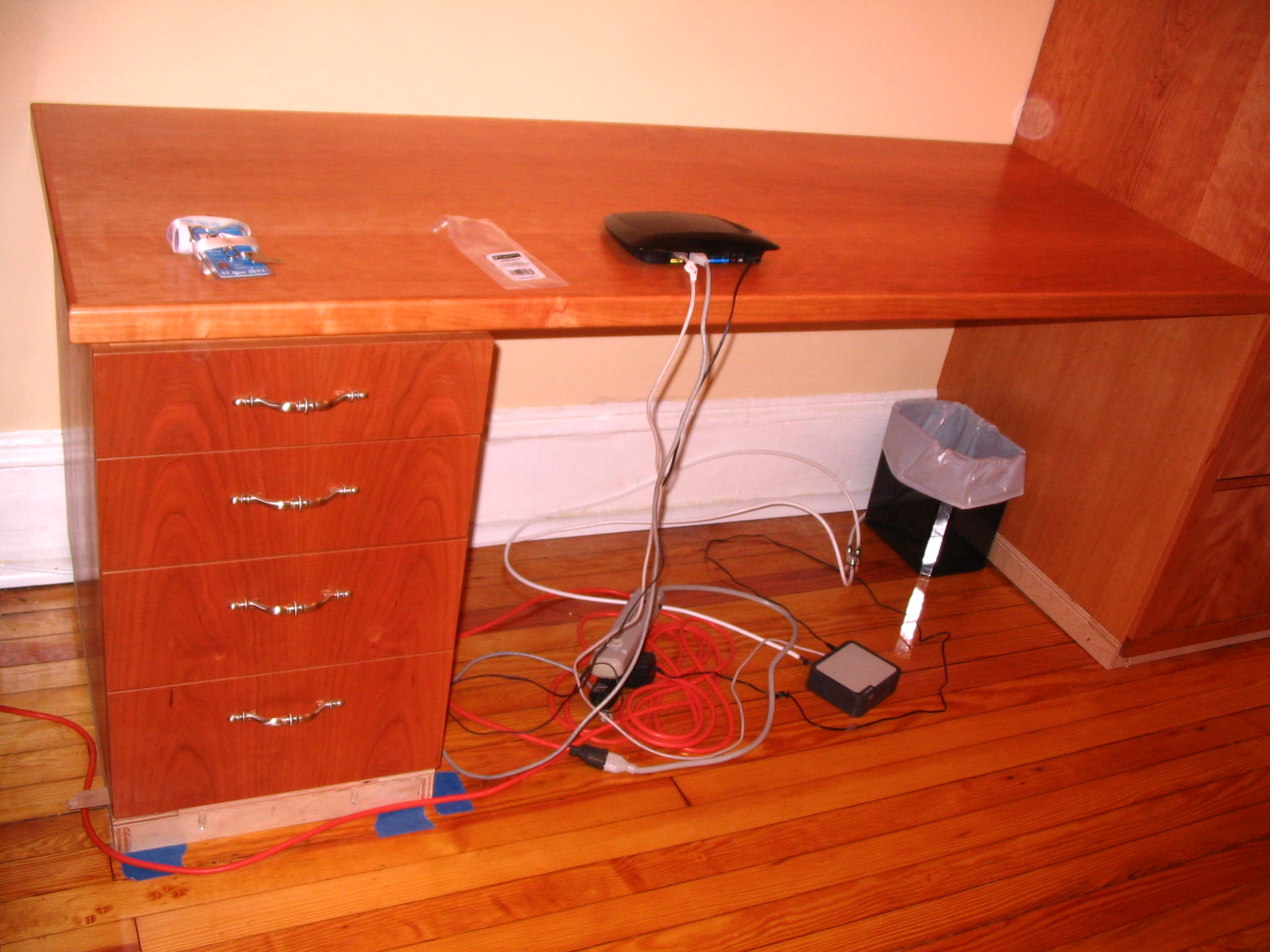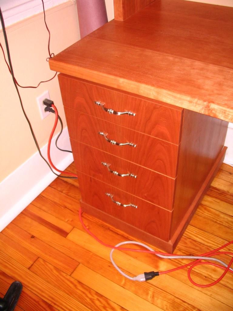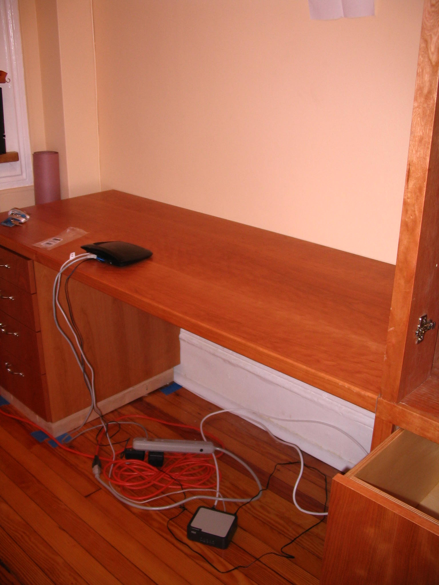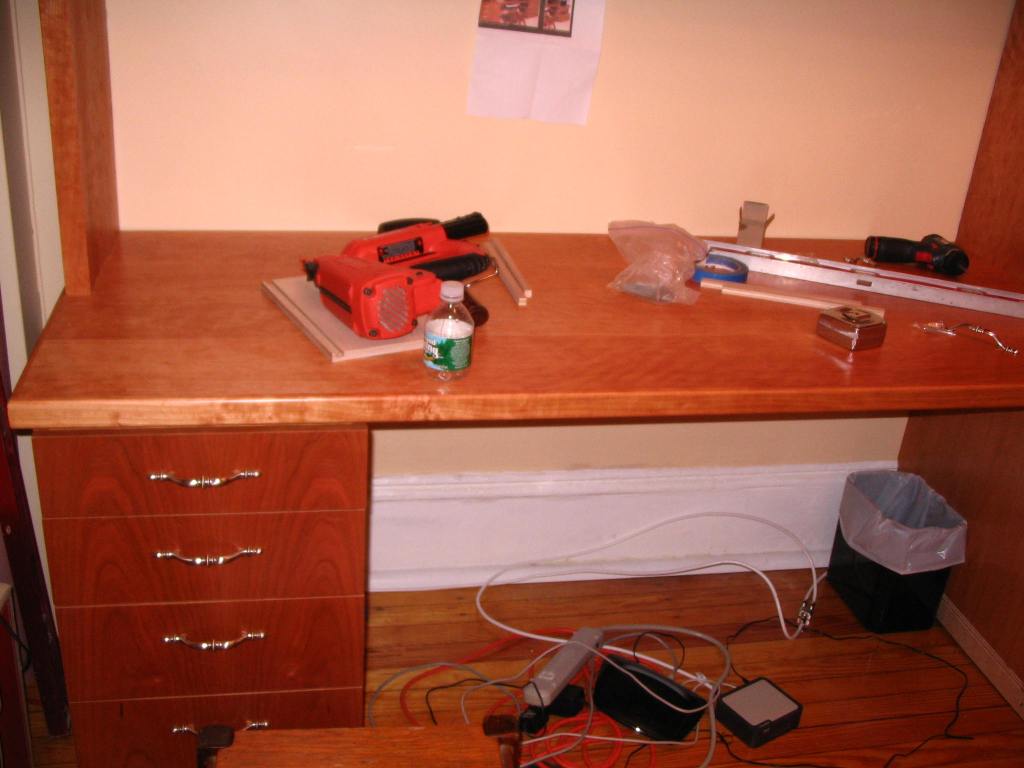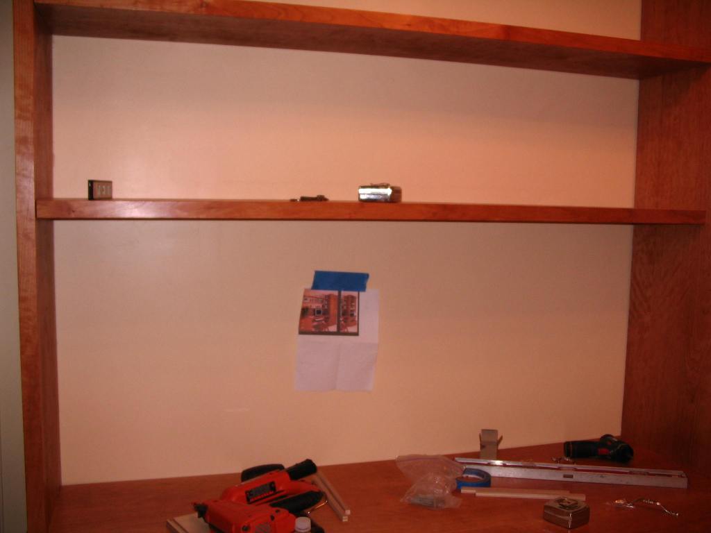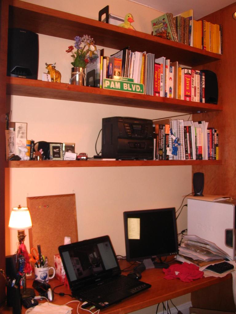 Remember when we posted the photo of the Office/Library/Desk we wanted to have built in our office? Here it is, in stages, as it was being installed. Our carpenter, John Netherton, did an amazing job. The desk is now completed and we are delighted with the results. We have two file cabinets on the bottom right, four drawers on the left, a closet on the right with five shelves and over the desk itself, three wide shelves for books. Now we are tasked with doing the grunt work: filing, sorting, and editing, which is the stinky part of creating one’s home office.