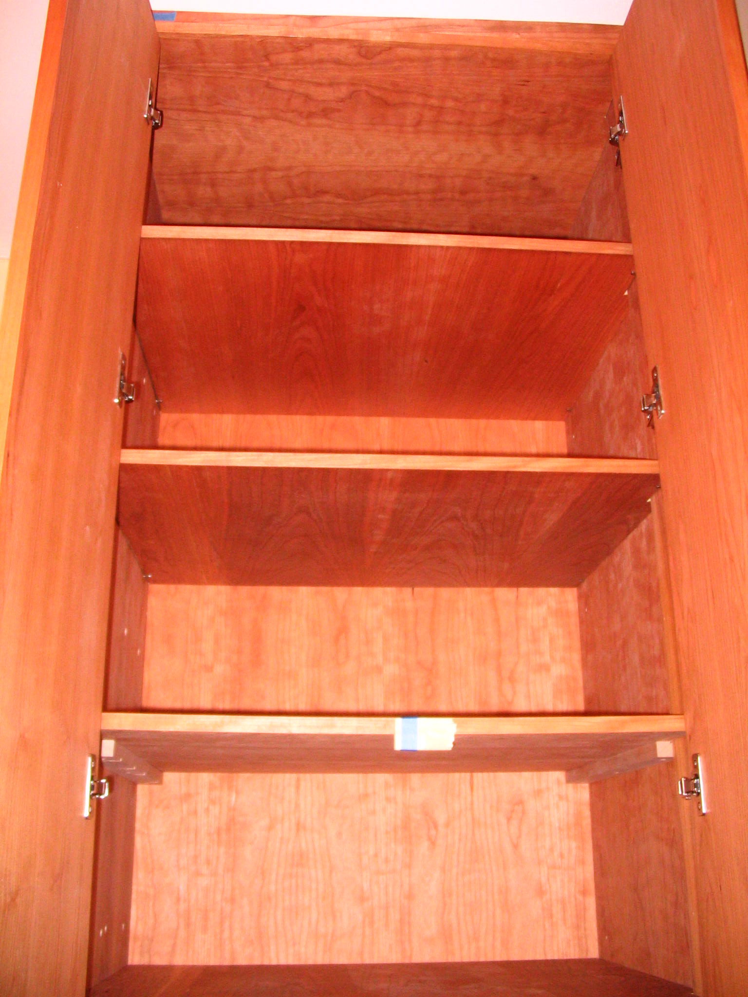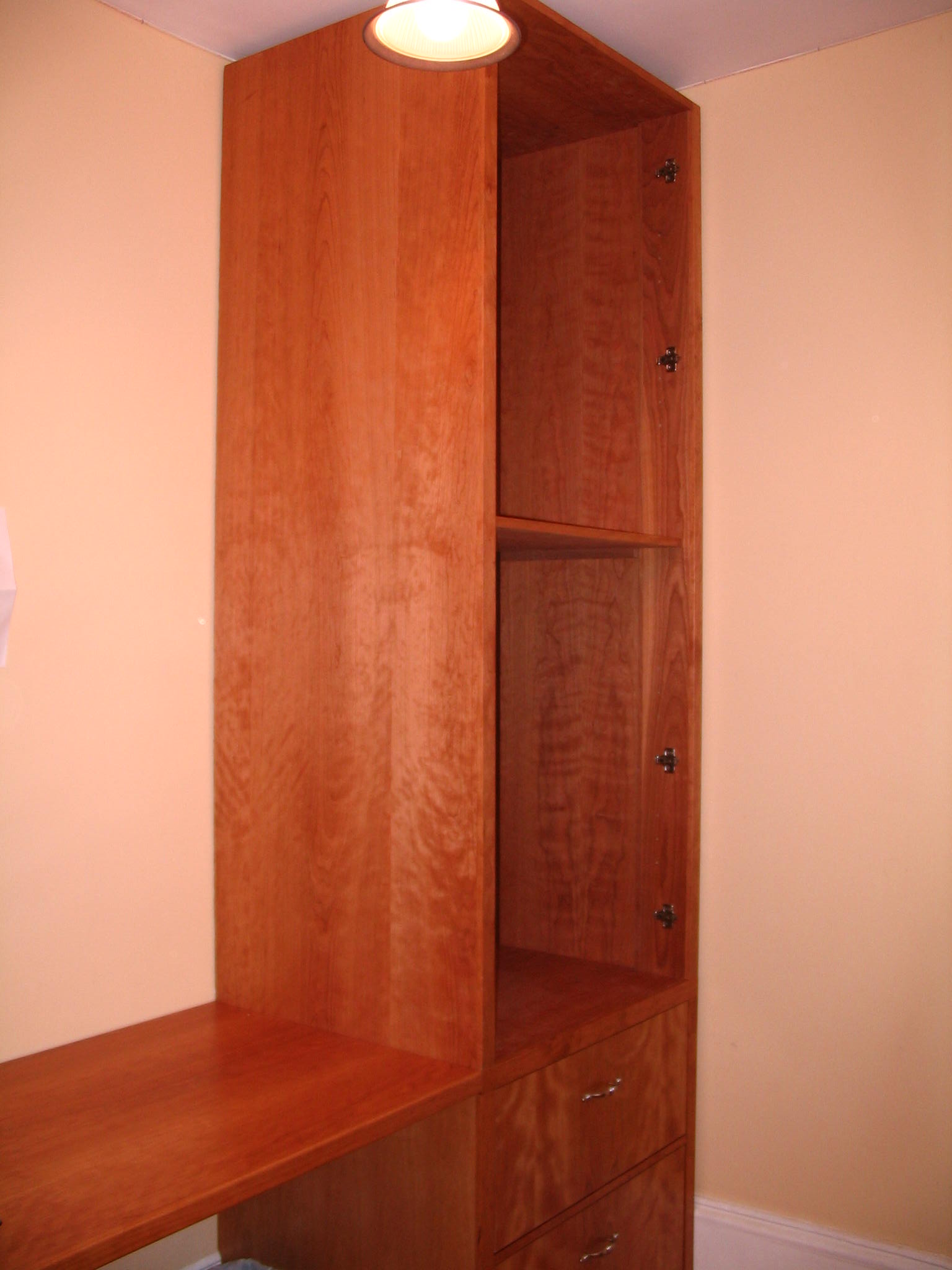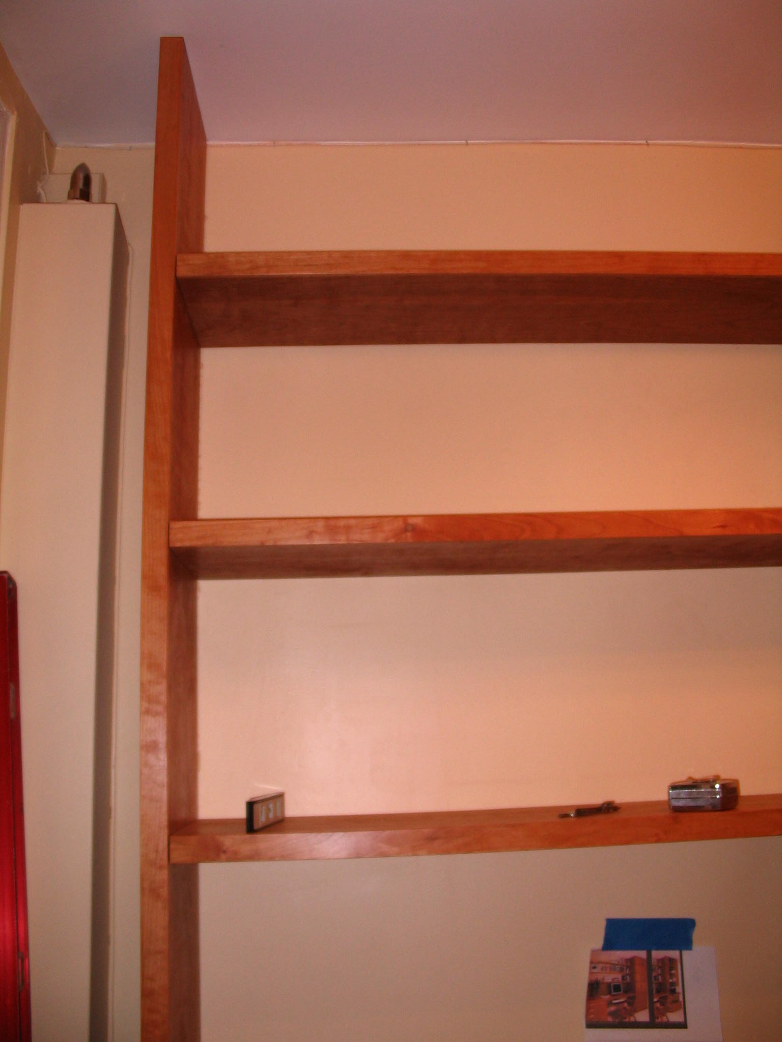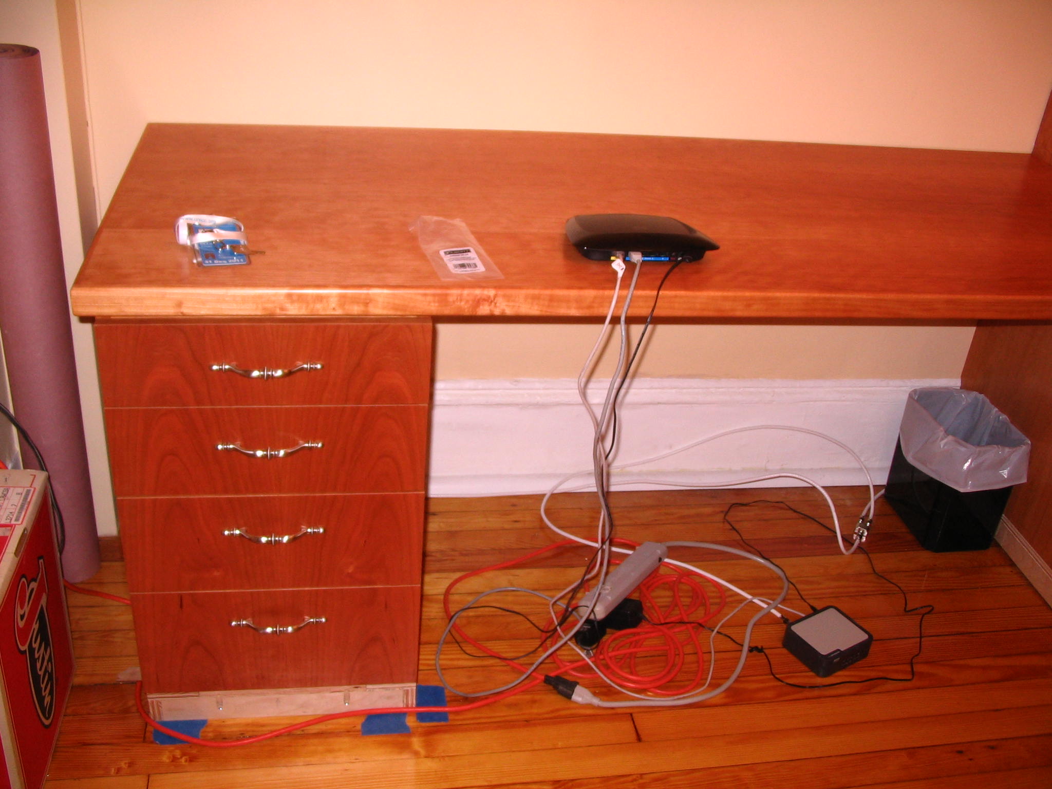 Remember when we posted the photo of the Office/Library/Desk we wanted to have built in our office? Here it is, in stages, as it was being installed. Our carpenter, John Netherton, did an amazing job. The desk is now completed and we are delighted with the results. We have two file cabinets on the bottom right, four drawers on the left, a closet on the right with five shelves and over the desk itself, three wide shelves for books. Now we are tasked with doing the grunt work: filing, sorting, and editing, which is the stinky part of creating one’s home office.